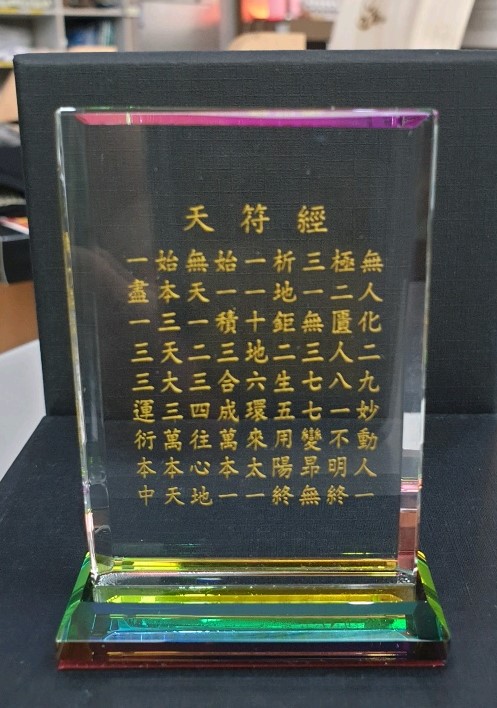 상품명 : 크리스탈 천부경 액자(차량용) 제조국, 원산지 : 한국 천부경 글자색 : 순금색 골드 글자체 : 해서체 <제품 구성 및 규격> 천부경 크리스탈 원판: 가로 5 cm , 높이 7 cm , 두께 0.8 cm 바닥 크리스탈 받침 : 가로 6 cm , 세로 2 cm , 높이 0.8 cm 포장 케이스 : 고급 종이박스 케이스 가로 9 cm , 세로 10.5 cm , 높이 3 cm 바닥 부착용 테이프 : 3M 사 제품 강력 접착테이프 A/S : 김경희 041-620-6831